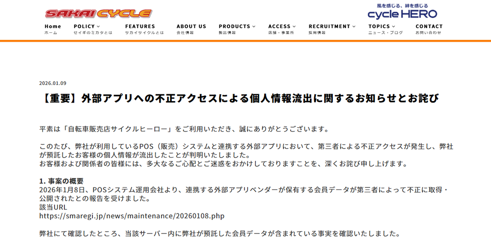 説明によると同社は2026年1月8日、POS(販売)システムの運用会社から、連携する外部アプリベンダーが保有する会員データが第三者により不正に取得され、公開されたとの報告を受けました。同社が確認したところ、当該サーバー内にサイクルヒーローが預託していた会員データが含まれていたことが判明しました。同社はこのため、サイクルヒーローから該当する外部アプリとのデータ連携および通信を直ちに遮断しました。
