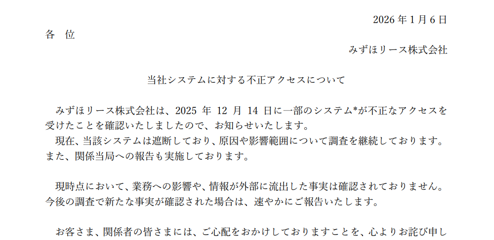 みずほリース株式会社は2026年1月6日、同社の一部システムが不正アクセスを受けたことを公表しました。