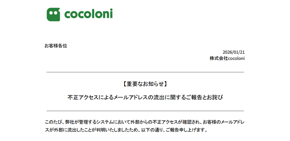 株式会社cocoloniは2026年1月21日、同社が管理するシステムに対する不正アクセスにより、利用者のメールアドレスが外部に流出したと発表しました。