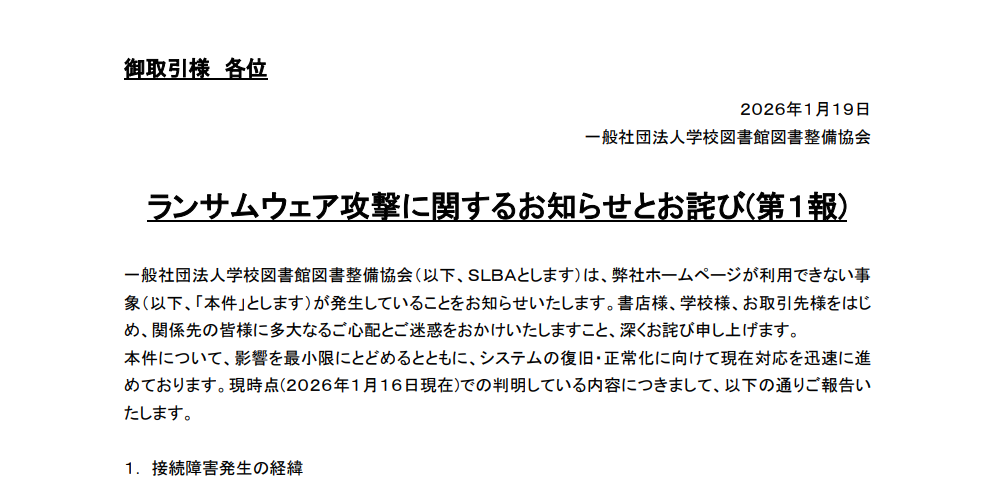 発表によると2026年1月7日、協会のホームページへの接続障害が発生しました。運用・保守を委託している会社が調査を実施したところ、ランサムウェアを含む、第三者による不正アクセスの可能性が判明。書籍検索や選書リスト作成、ホームページ上での発注や納期確認など、ウェブを通じたすべてのサービスが利用できない状態が続いています。