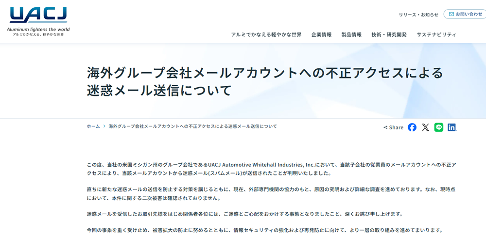 株式会社UACJは2026年1月、同社の海外グループ会社において、不正アクセスにより迷惑メールが送信される事案が発生したと発表しました。
