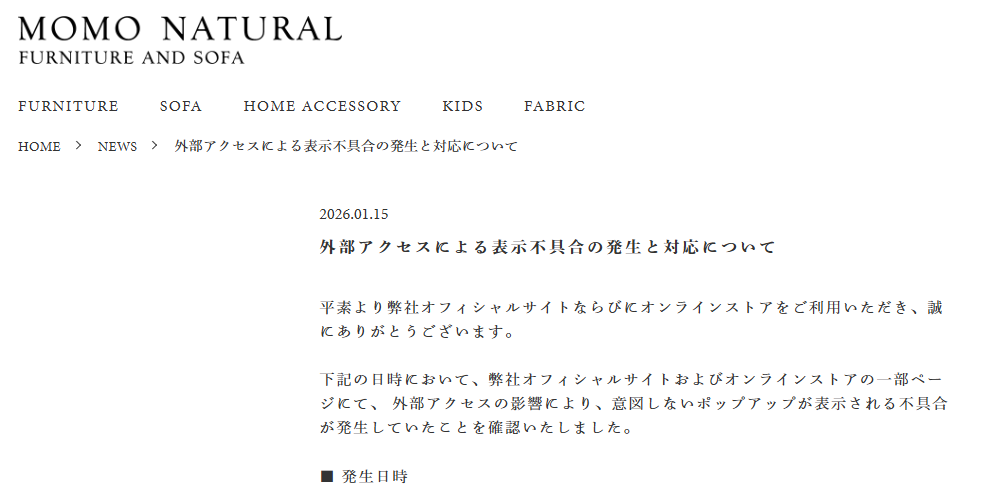 同社によると不正アクセスの影響により、オフィシャルサイトおよびオンラインストアの一部ページで、意図しないポップアップが表示される事象が発生しました。同社はこのため、対象期間(2025年12月24日~2026年1月13日)に会員登録や購入手続きをしたユーザーに対し、連絡を取っています。