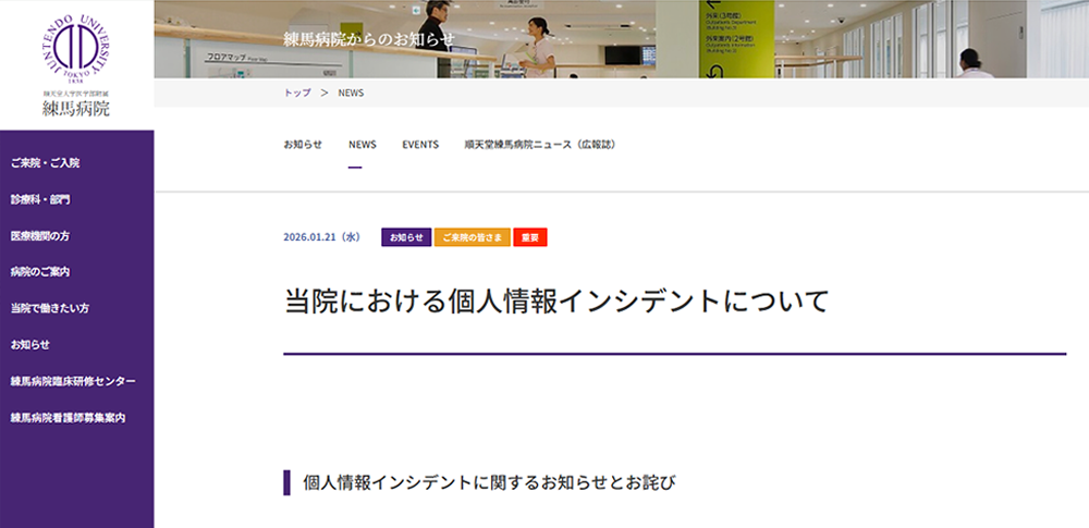 参照当院における個人情報インシデントについて|順天堂大学医学部附属練馬病院