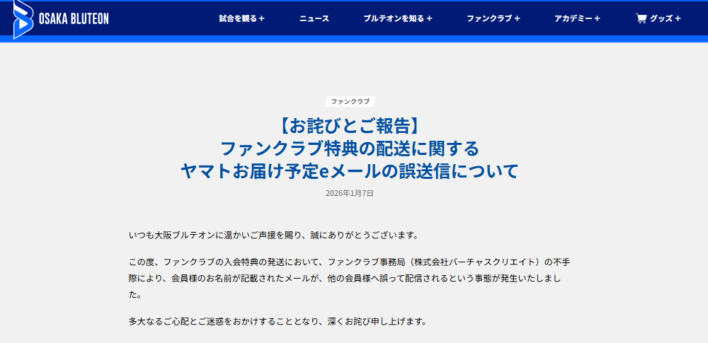 大阪ブルテオンは2026年1月7日b、ファンクラブ特典の配送に関連し、会員の氏名が第三者に伝わるメール誤送信が発生したと公表しました。