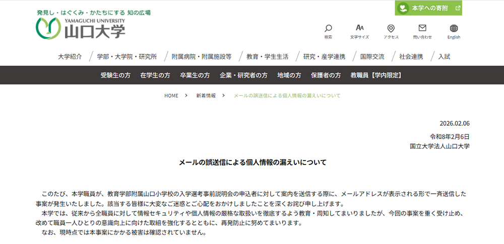 国立大学法人山口大学は2026年2月6日、教育学部附属山口小学校の入学選考事前説明会に関する案内メールの送信において、誤った宛先設定により個人情報が漏えいした可能性があると発表しました。