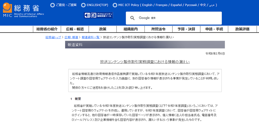 総務省は2026年2月6日、令和7年度の「放送コンテンツ製作取引実態調査」において、アンケート回答用ウェブサイトを通じた他者の個人情報や企業情報の漏えいが発生したと発表しました。