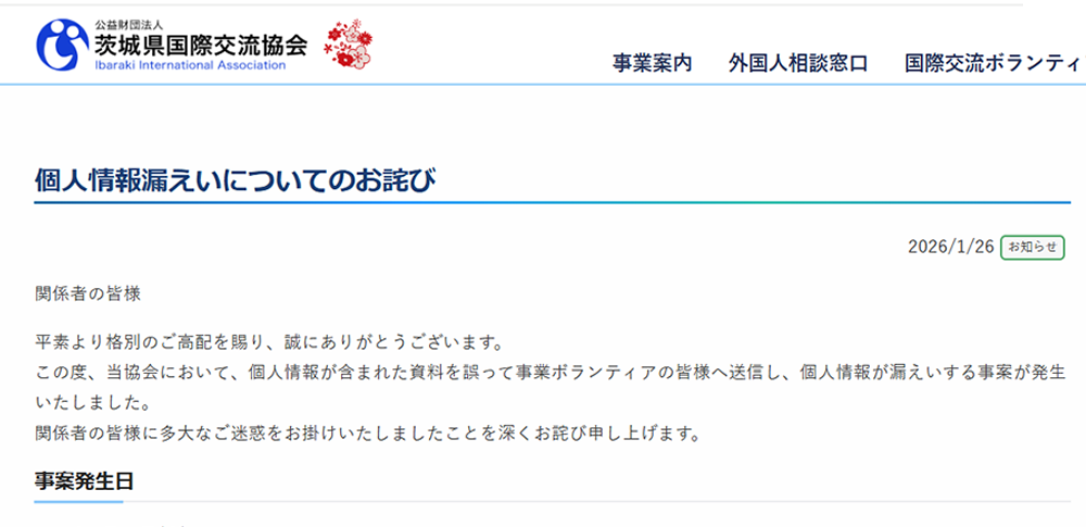 公益財団法人茨城県国際交流協会は2026年1月26日、協会が管理する個人情報が誤送信により漏えいしたと発表しました。