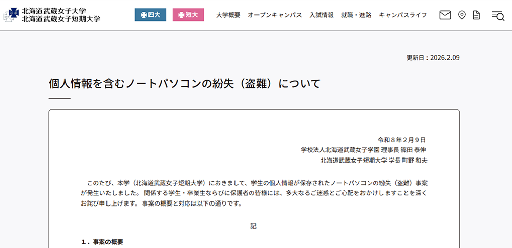 北海道武蔵女子短期大学は2026年2月9日、非常勤講師が所有していた学生の個人情報が保存されたノートパソコンの紛失による、情報漏洩の可能性を発表しました。