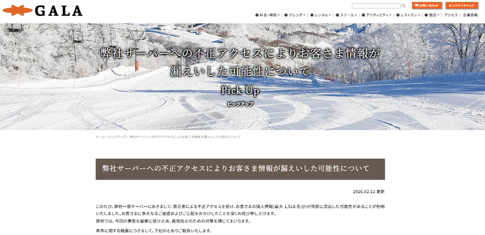 株式会社ガーラ湯沢は2026年2月12日、一部サーバーが第三者による不正アクセスを受け、最大1,518人分の顧客個人情報が外部に漏えいした可能性があると発表しました。