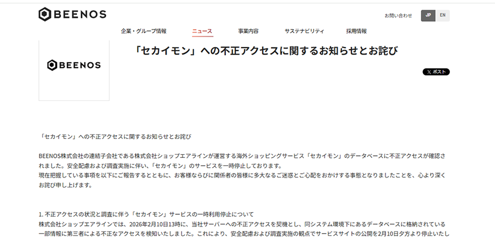 BEENOS株式会社は2026年2月13日、連結子会社の株式会社ショップエアラインが運営する海外ショッピングサービス「セカイモン」にて不正アクセスが確認され、サービスの一時停止を発表しました。