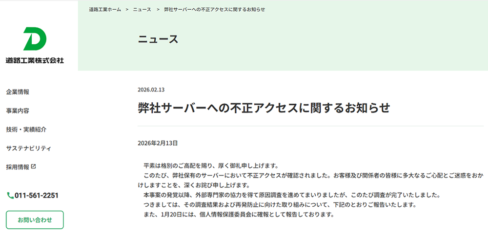 道路工業株式会社は2026年2月13日、同社が保有・運用するサーバーに対して外部の第三者による不正アクセスが確認されたと発表しました。