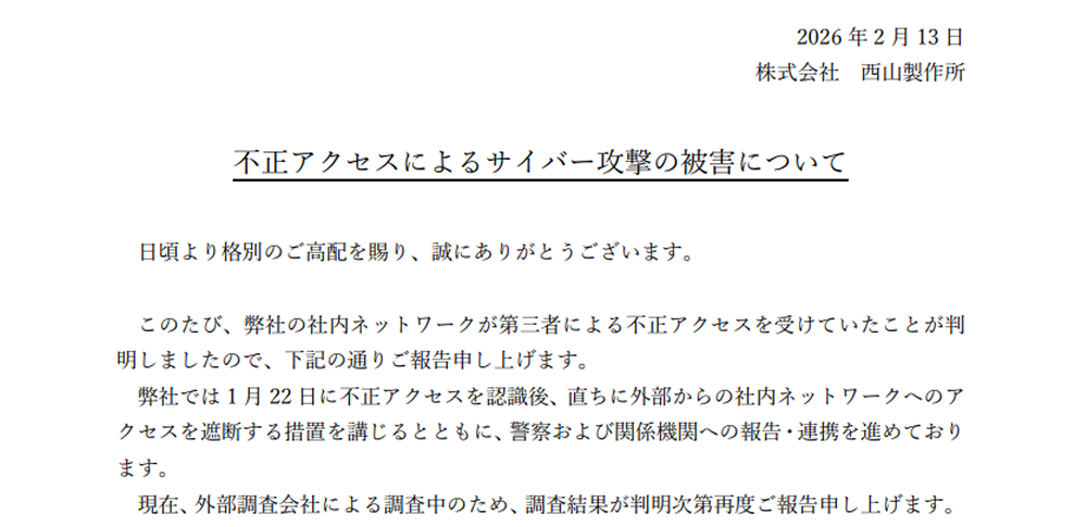 株式会社西山製作所は2026年2月13日、社内ネットワークが第三者による不正アクセスを受け、ランサムウェアに感染したと発表しました。