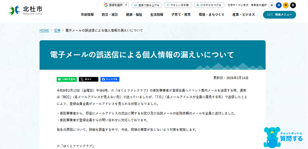 北杜市(山梨)は2026年2月14日、市の「ほくとファンクラブ」運営委託事業者による電子メールの誤送信により、登録会員586人のメールアドレスが第三者に見える状態となる個人情報漏えい事案が発生したと発表しました。
