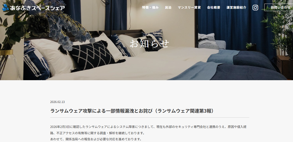 あなぶきハウジンググループは2026年2月13日までに、グループの一部サーバーにて発生したランサムウェア攻撃に関する調査の結果、一部の情報資産について情報漏洩が確認されたと公表しました。