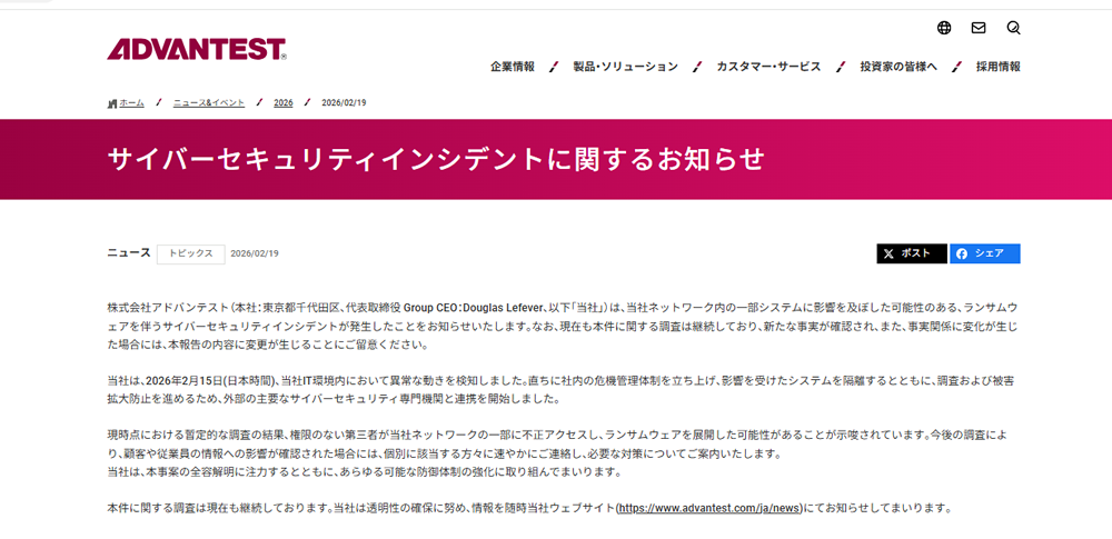 株式会社アドバンテストは2026年2月19日、同社ネットワーク内の一部システムにおいて、ランサムウェア感染を伴うセキュリティインシデントを発表しました。