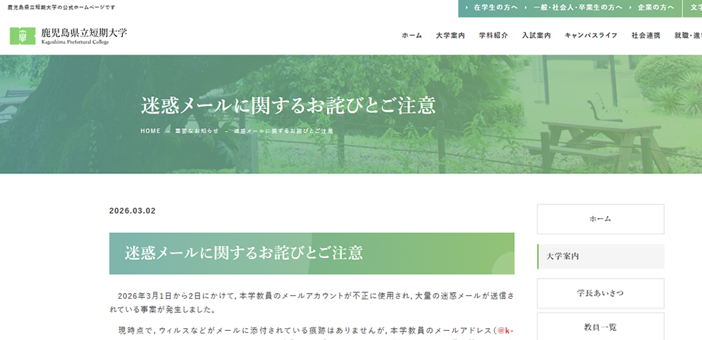 鹿児島県立短期大学は2026年3月2日、同大学の教員メールアカウントが第三者に不正使用され、大量の迷惑メールが送信される事案が発生したと発表しました。