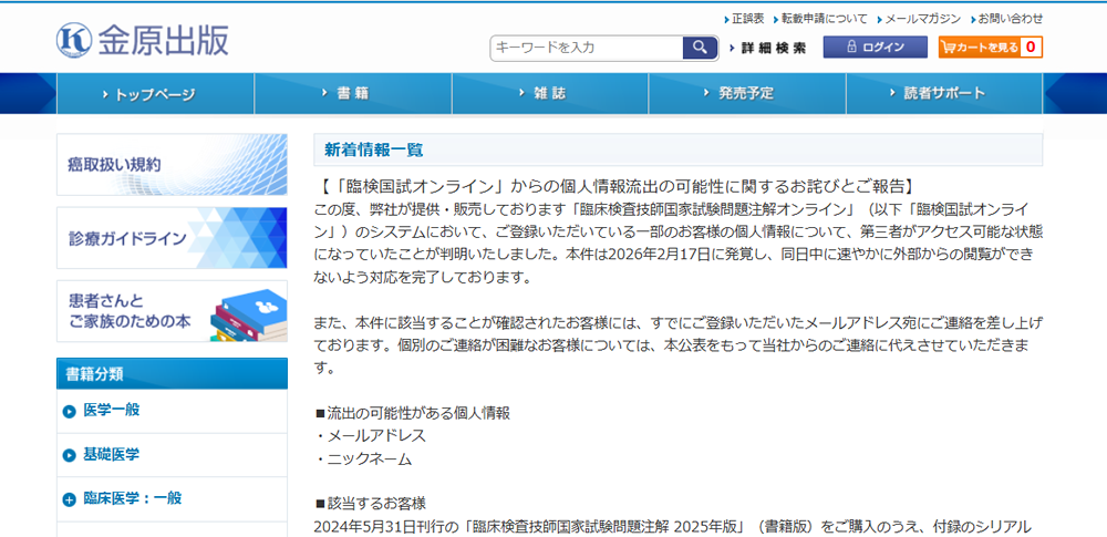 金原出版株式会社は2026年3月3日、同社が提供する「臨床検査技師国家試験問題注解オンライン」(臨検国試オンライン)のシステムにおいて、一部利用者の個人情報が第三者からアクセス可能な状態にあり、情報漏えいの可能性を発表しました。