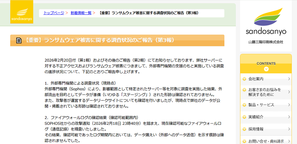山藤三陽印刷株式会社は2026年3月3日までに、同社サーバーが外部からの不正アクセスを受けランサムウェアに感染したことを明らかにしました。