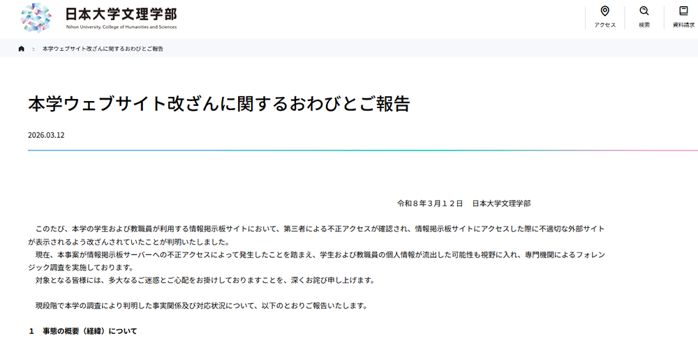 日本大学は2026年3月12日、文理学部の学生や教職員が利用する情報掲示板サイトに対する第三者による不正アクセスに伴い、改ざん被害が確認されたと発表しました。