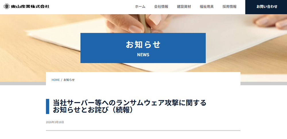 東山産業は2026年3月10日、同社サーバーなどに対する第三者からの不正アクセスにより、ランサムウェア攻撃の被害を受けたと発表しました。
