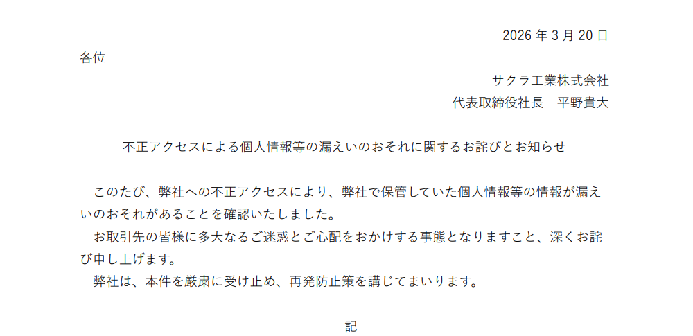 サクラ工業株式会社は2026年3月20日、不正アクセスにより同社が保管する、主に社員および取引先関係者の個人情報について、漏えいの可能性を発表しました。