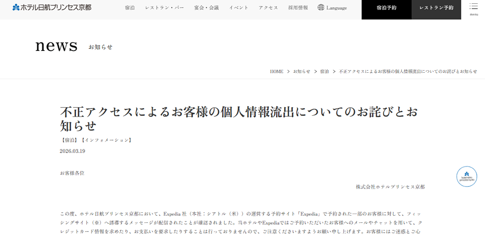 株式会社ホテルプリンセス京都は2026年3月19日、同社が運営するホテル日航プリンセス京都において、宿泊予約サイトの管理者アカウントが不正ログインにより不正利用され、利用者情報が閲覧された可能性があるほか、フィッシング目的の不正メッセージ送信が確認されたと発表しました。