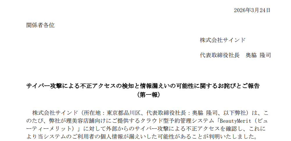 株式会社サインドは2026年3月24日、理美容店舗向けクラウド型予約管理システム「BeautyMerit(ビューティーメリット)」に対するサイバー攻撃による不正アクセスを検知し、利用者の個人情報が漏えいした可能性があると発表しました。