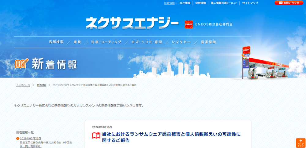 ネクサスエナジー株式会社は2026年3月19日、同社サーバーが第三者による不正アクセスを受けてランサムウェアに感染した事案について、個人情報の漏えいの可能性を発表しました。