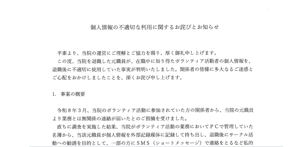 聖ヨゼフ病院は2026年3月12日、退職した元職員が在職中に知り得たボランティア活動者の個人情報を持ち出し、退職後に不適切に利用していたと発表しました。