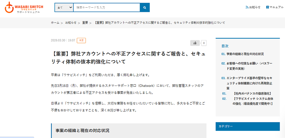 株式会社ワサビは、同社が提供する「ワサビスイッチ」のカスタマーサポート窓口で利用していたChatworkアカウントに第三者が不正アクセスしたと発表しました。