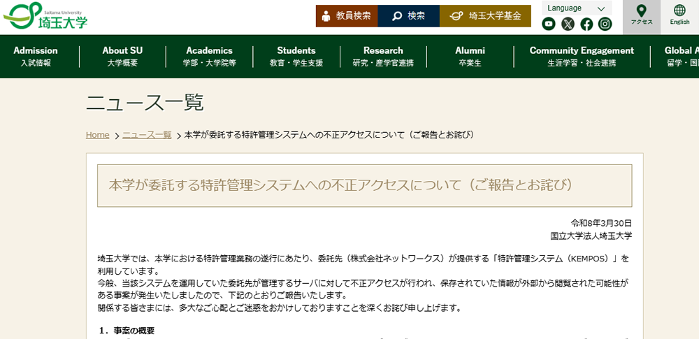 国立大学法人埼玉大学は2026年3月30日、特許管理業務に関連する業務委託先である株式会社ネットワークスが提供する特許管理システム「KEMPOS」に対する不正アクセスの影響により、保存されていた情報が漏えいした可能性について公表しました。