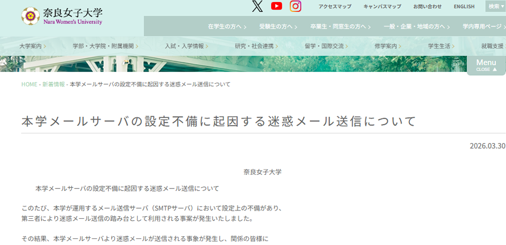 奈良女子大学は2026年3月30日、同学が運用するメール送信サーバの設定不備を突いた不正アクセスに伴い、サーバが第三者に迷惑メール送信の踏み台として悪用されていたと発表しました。
