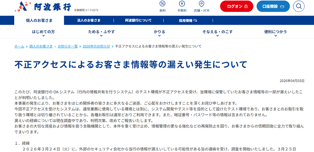 阿波銀行は2026年4月3日、行内の情報共有に使うシステムのテスト環境が不正アクセスを受け、一部の顧客情報などが漏えいしたと発表しました。