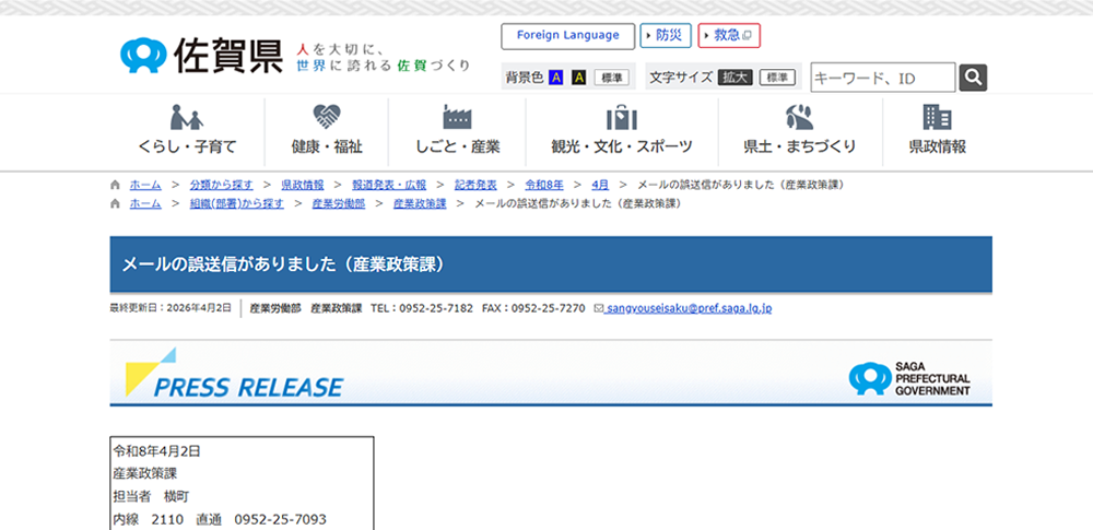 佐賀県は2026年4月2日、産業政策課において発信した補助金関連メールにおいて、個人情報を含むメールの誤送信があったと発表しました。