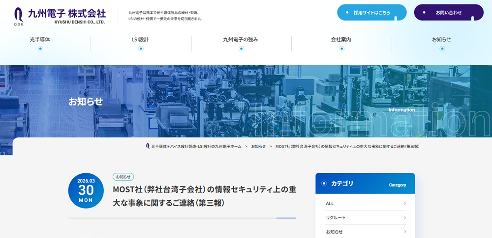 九州電子株式会社は2026年3月30日までに、台湾子会社のMOST社のメールサーバーが第三者による不正アクセスを受け、ランサムウェアに感染したことを公表しました。