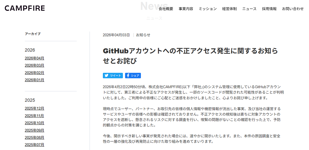 株式会社CAMPFIREは2026年4月2日、システム管理に利用しているGitHubアカウントに対し、第三者による不正アクセスが発生したと発表しました。一部のソースコードが閲覧された可能性があるとしています。