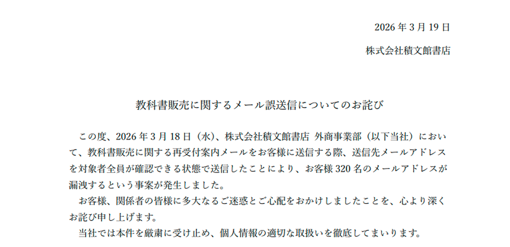 株式会社積文館書店は2026年3月19日、教科書販売に関する案内メールの送信時に宛先設定を誤り、顧客320人のメールアドレスを漏えいしたと発表しました。