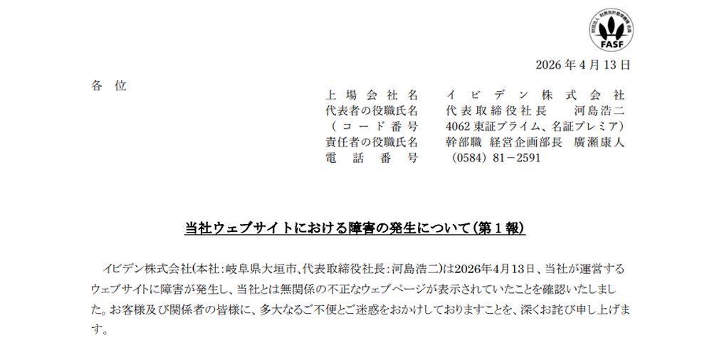 イビデン株式会社は2026年4月13日、同社が運営するウェブサイトで障害が発生し、同社とは無関係の不正なウェブページが表示される状態になっていたと発表しました。