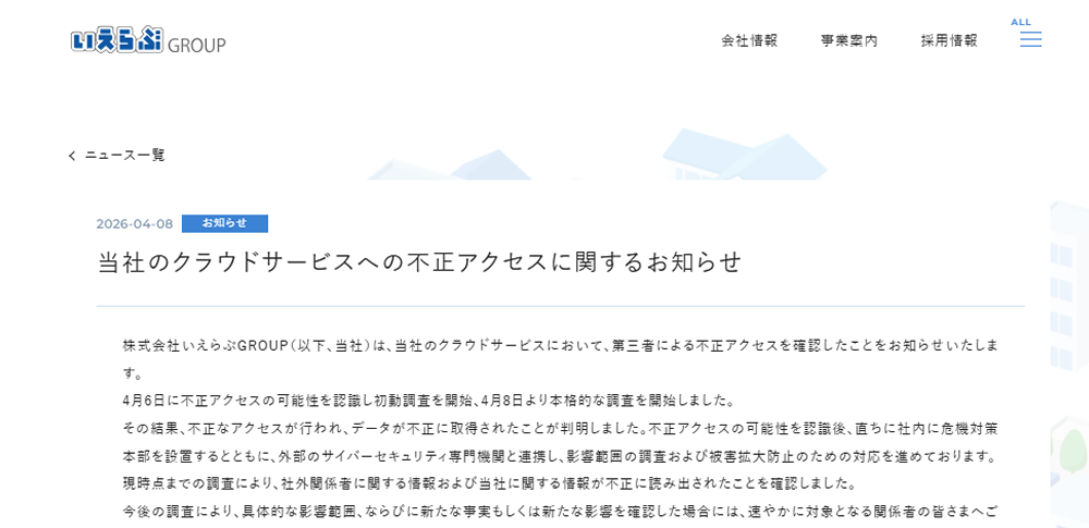 株式会社いえらぶGROUPは2026年4月8日、自社のクラウドサービスに対する第三者の不正アクセスが発生し、情報が不正に取得されたと発表しました。