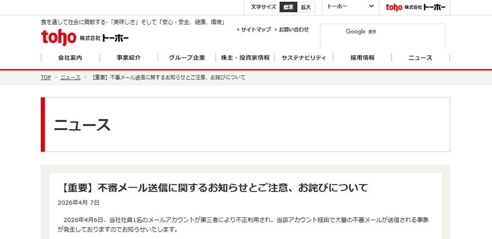 株式会社トーホーは2026年4月7日、所属社員のメールアカウントが第三者に不正利用され、当該アカウントを経由して大量の不審メールが送信される事象が発生したと発表しました。
