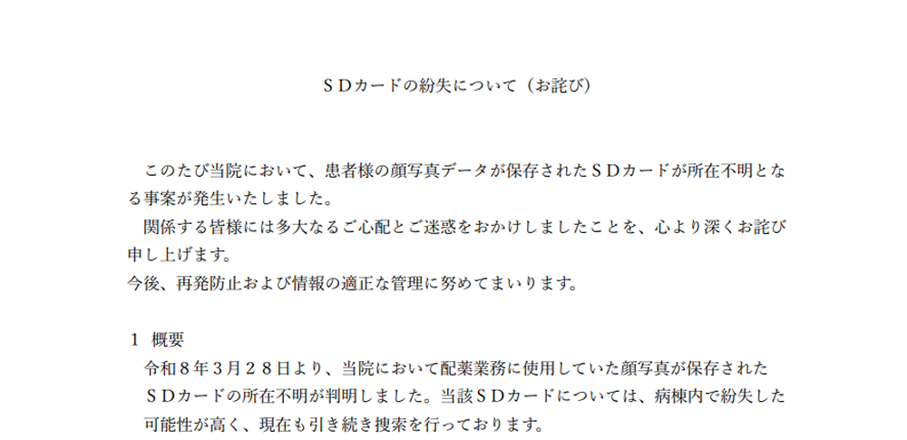 同院によると、2026年3月28日以降、配薬業務に使用していたSDカードの所在不明となっていることが判明しました。同院は院内の病棟で紛失した可能性が高いとして、捜索を現在も捜索を行っているものの、公表時点で発見には至っていません。