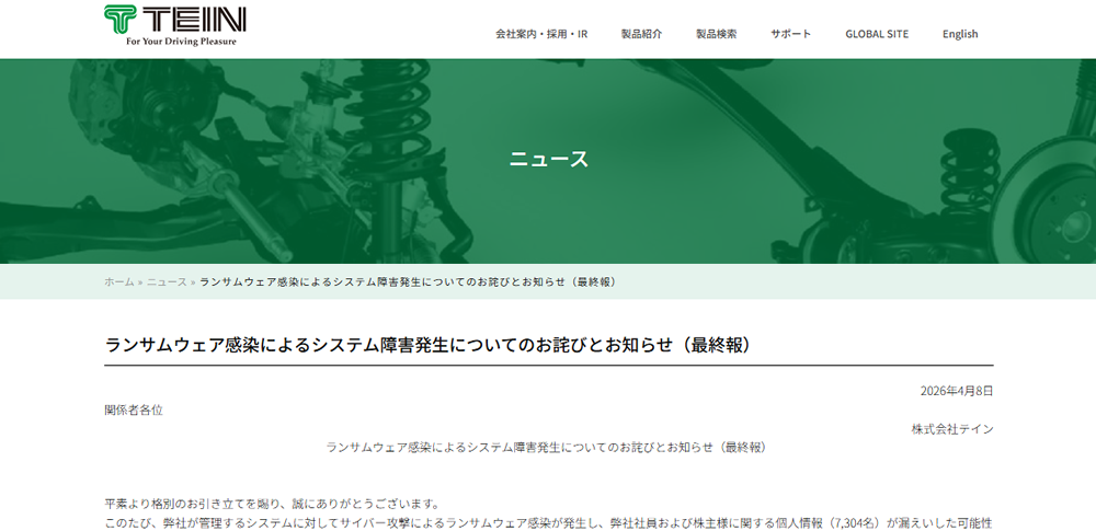 株式会社テインは2026年4月8日、同社システムがランサムウェアに感染した問題について最終報を公表し、社員や株主など計7,304人分の個人情報が漏えいした可能性があると発表しました。