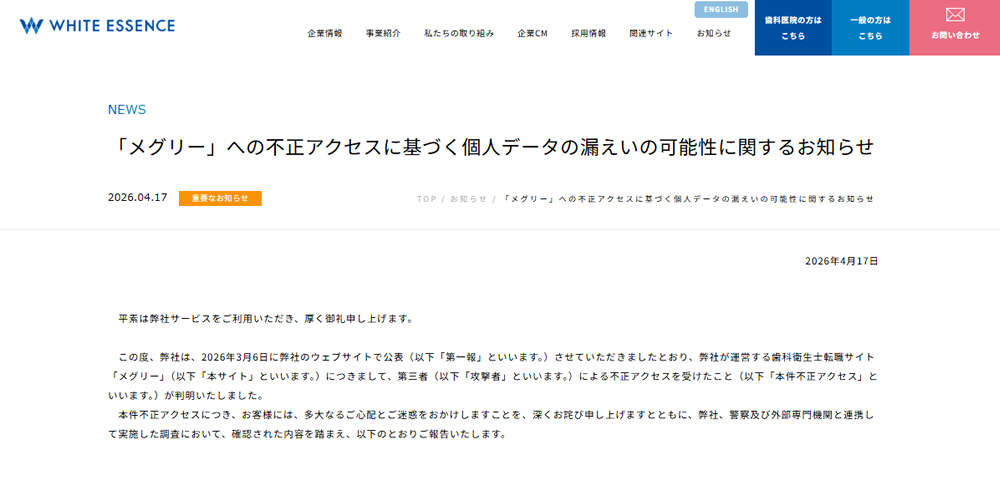 ホワイトエッセンス株式会社は2026年4月17日、同社が運営する歯科衛生士向け転職サイト「メグリー」における不正アクセス事案について、個人データの漏えいの可能性が高いとする続報を発表しました。
