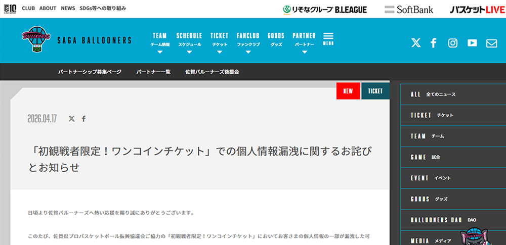 プロバスケットボールチームの佐賀バルーナーズは2026年4月17日、同チームが実施したキャンペーン「初観戦者限定!ワンコインチケット」において、申込者の個人情報が外部から閲覧可能な状態となっていた可能性があると発表しました。