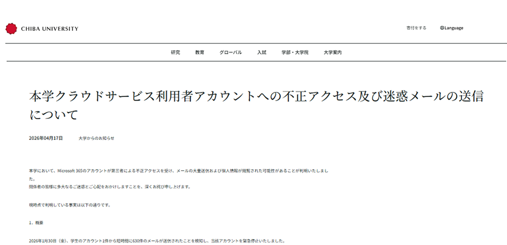 国立大学法人千葉大学は2026年4月17日、同大学で利用しているMicrosoft 365のアカウントが第三者による不正アクセスを受け、迷惑メールの大量送信と、個人情報を含むデータが閲覧された可能性があると発表しました。