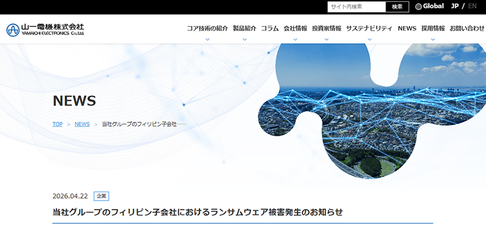山一電機株式会社は2026年4月22日、同社グループのフィリピン子会社であるPricon Microelectronics, Inc.の一部サーバーで、ランサムウェア被害が発生したことを確認したと発表しました。