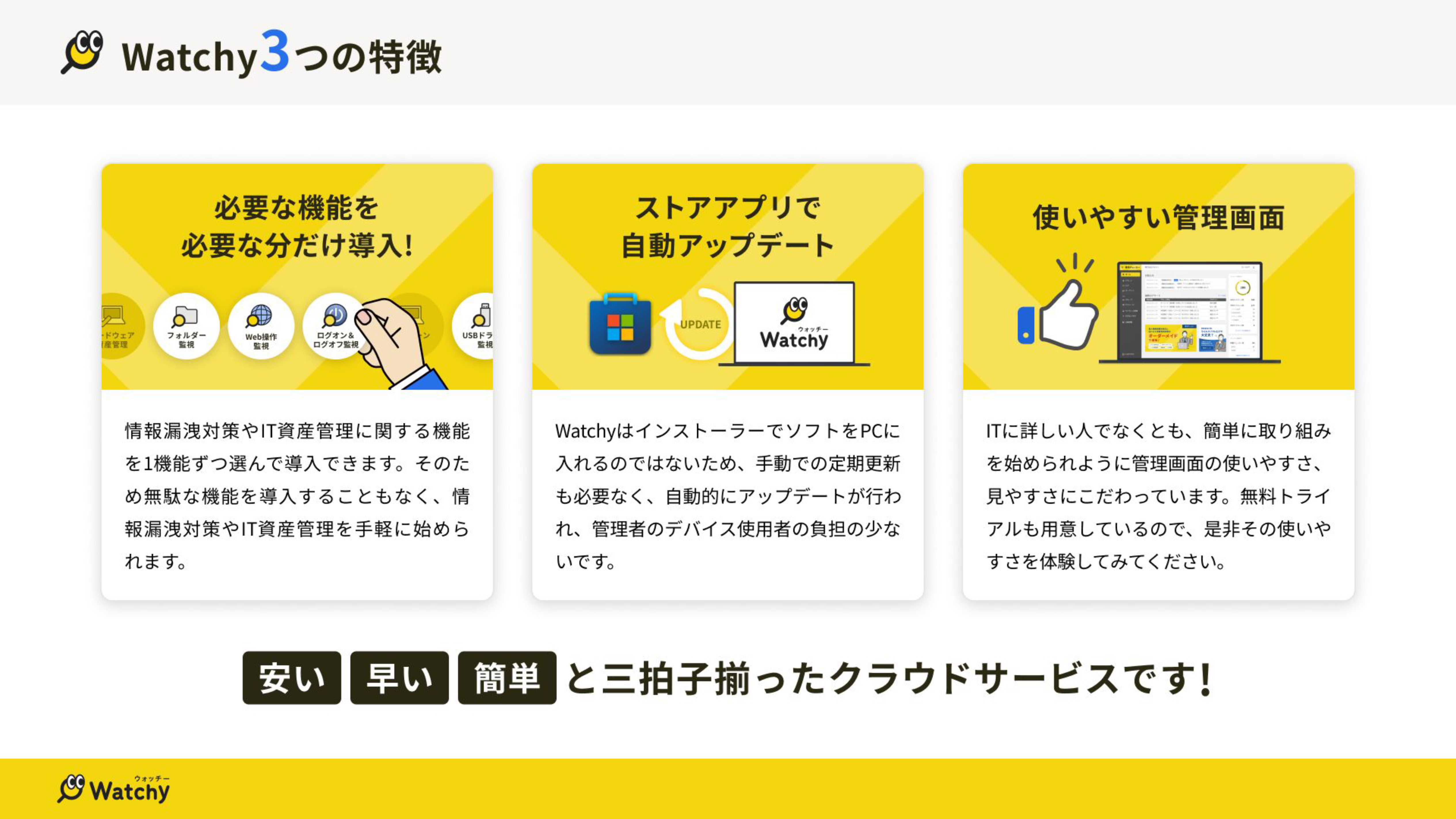 Watchy(ウォッチー)は人的ミスなどの内部情報の漏洩を防ぎ、自社に合った情報管理を構築できます。