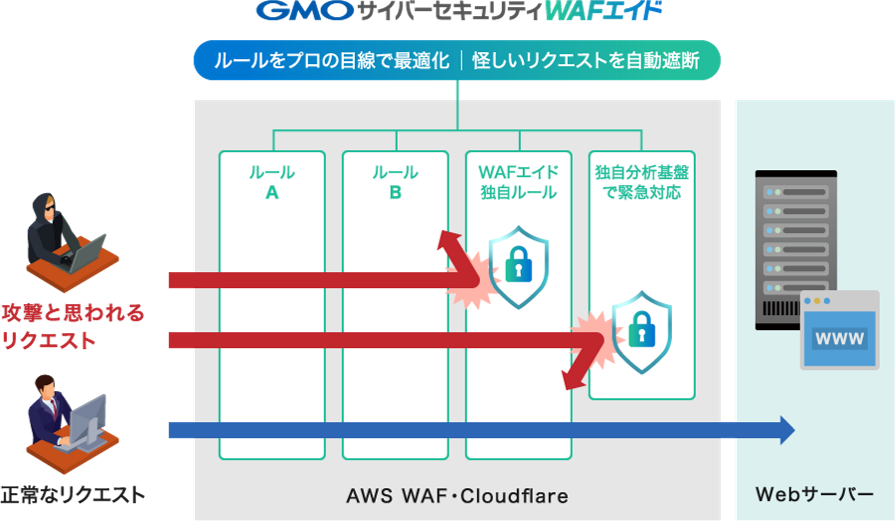 WAFエイドは、AWS WAF/Cloudflare WAFの運用を24時間365日で自動化する、WAFの自動運用サービスです。