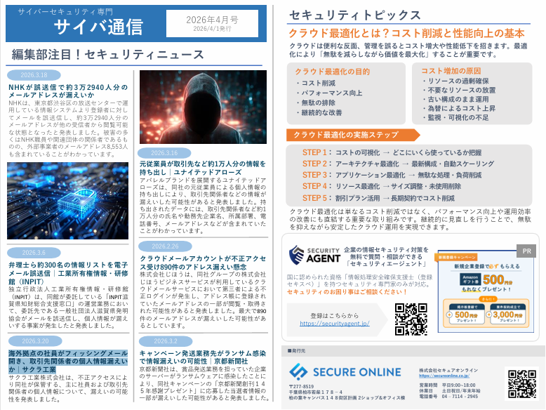 公開日:2026.04.01 | 最終更新日:2026.03.27 サイバ通信2026年4月号 無料メルマガ登録でプレゼント!書籍「セキュリティ対策の基礎知識」 サイバ通信_2026 4月号編集部注目!セキュリティニュース NHKが誤送信で約3万2940人分のメールアドレスが漏えいか 元従業員が取引先など約1万人分の情報を持ち出し│ユナイテッドアローズ 海外拠点の社員がフィッシングメール開き、取引先関係者の個人情報漏えいか│サクラ工業 その他、ニュースやセキュリティトピックス多数掲載! 関連コラム(あわせて、以下の記事もよく読まれています) No related posts. 製品・サービス(当該コラムの内容に関連する製品・サービスはこちら) 脆弱性調査・組織外脅威 通信調査 サービス(株式会社ワイ・イー・シー) サイバーレジリエンス評価支援サービス(ニュートン・コンサルティング株式会社) NetWitness Orchestrator(セキュリティ製品間の連携と脅威インテリジェンスの統合を実現した次世代型SOARソリューション)(RSA Security Japan 合同会社) ASM/脆弱性診断ツール「GMOサイバー攻撃ネットde診断 ASM」(GMOサイバーセキュリティ byイエラエ) ダウンロードにはメルマガ会員登録が必要です。 メルマガ会員登録はコチラ 登録がお済みの方は、こちらからログインしてください ユーザー名: パスワード: パスワードをお忘れの方はこちら 無料セキュリティ対策に不安がある企業必見!「セキュリティ対策無料相談窓口」 SNSでもご購読できます。